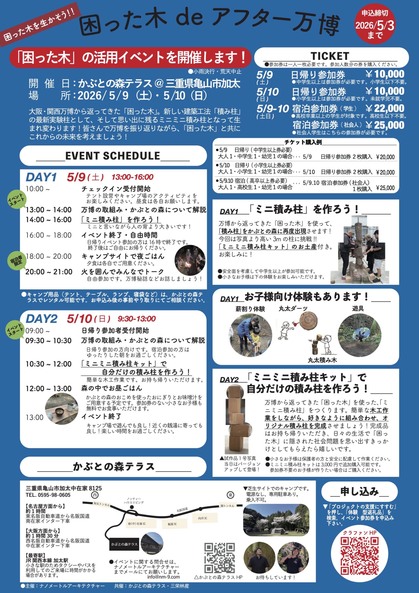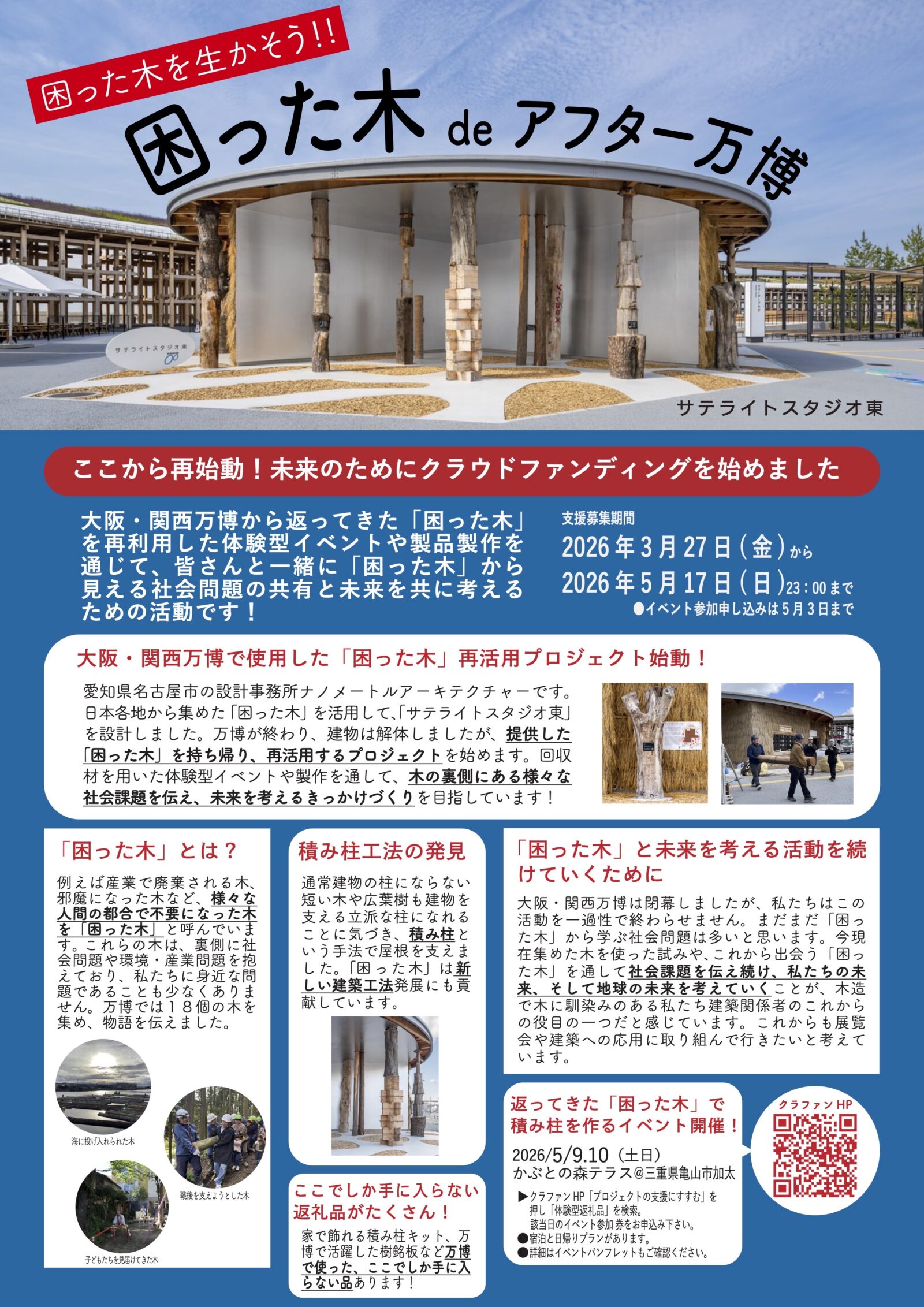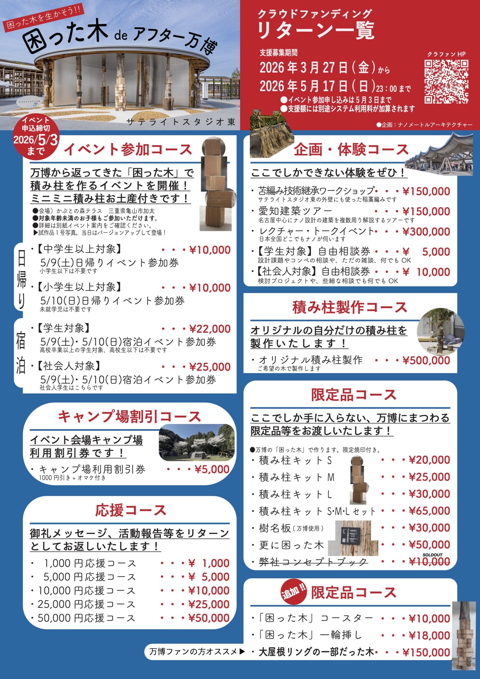 現在、ナノメートルアーキテクチャーさん(共催:三栄林産株式会社)でアフター万博を盛り上げる為のクラウドファンディングを実施しています。