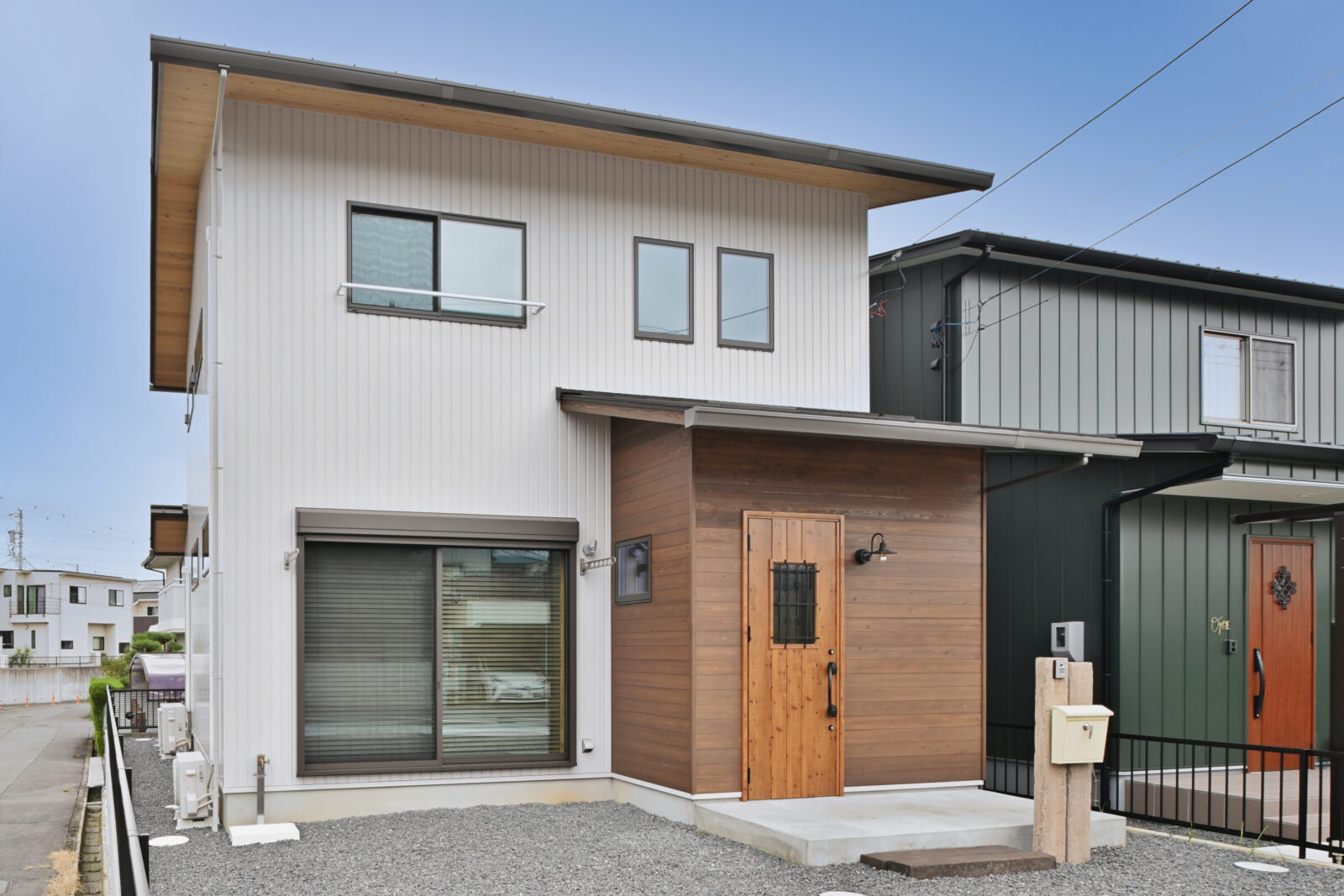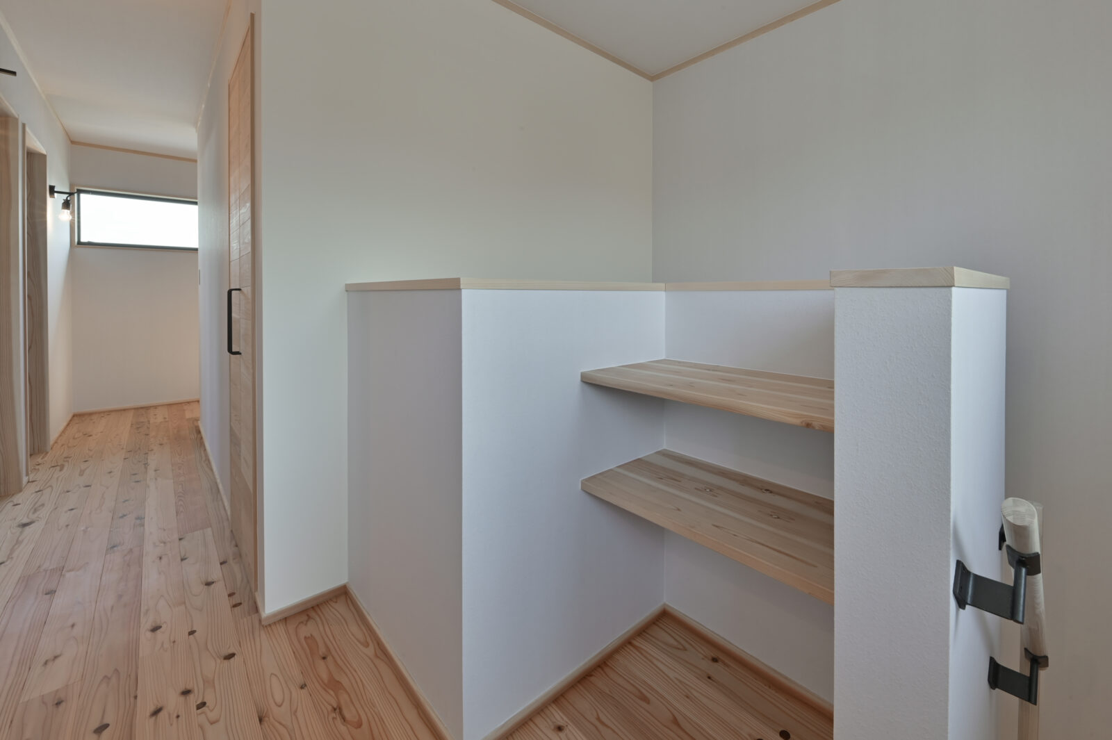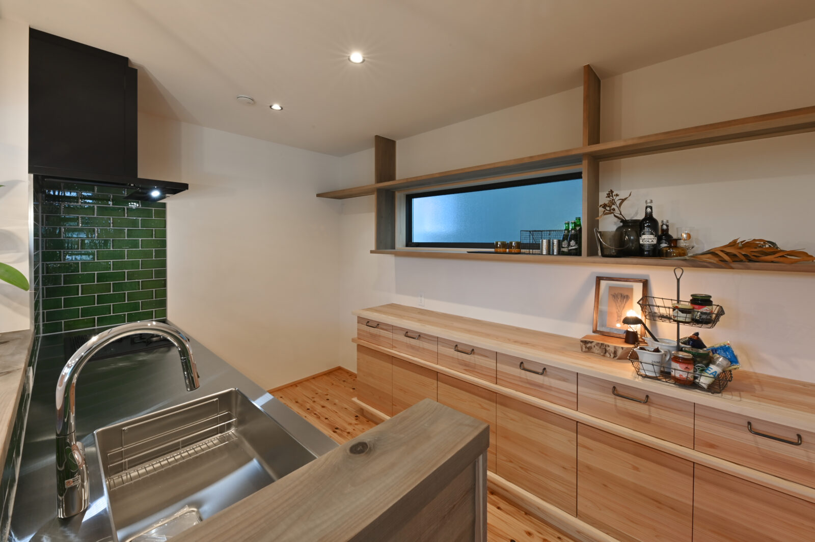 造り付けのオープン棚と合わせ、横のラインを強調するデザインにしています。