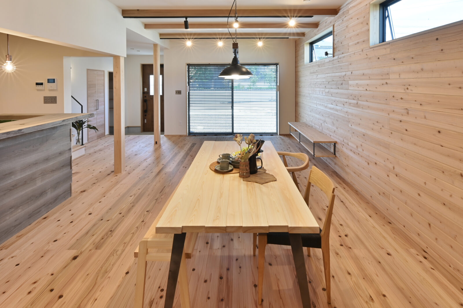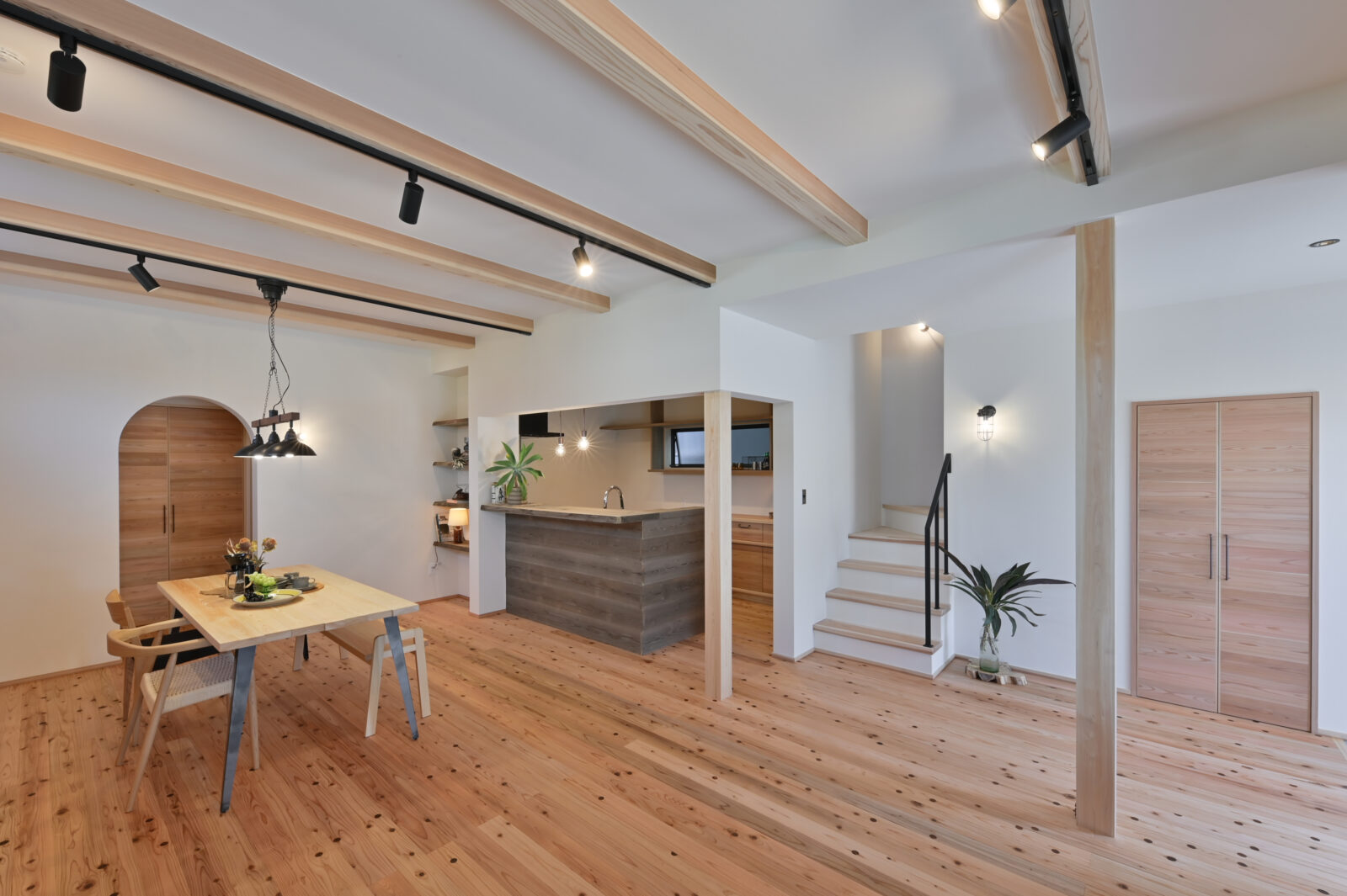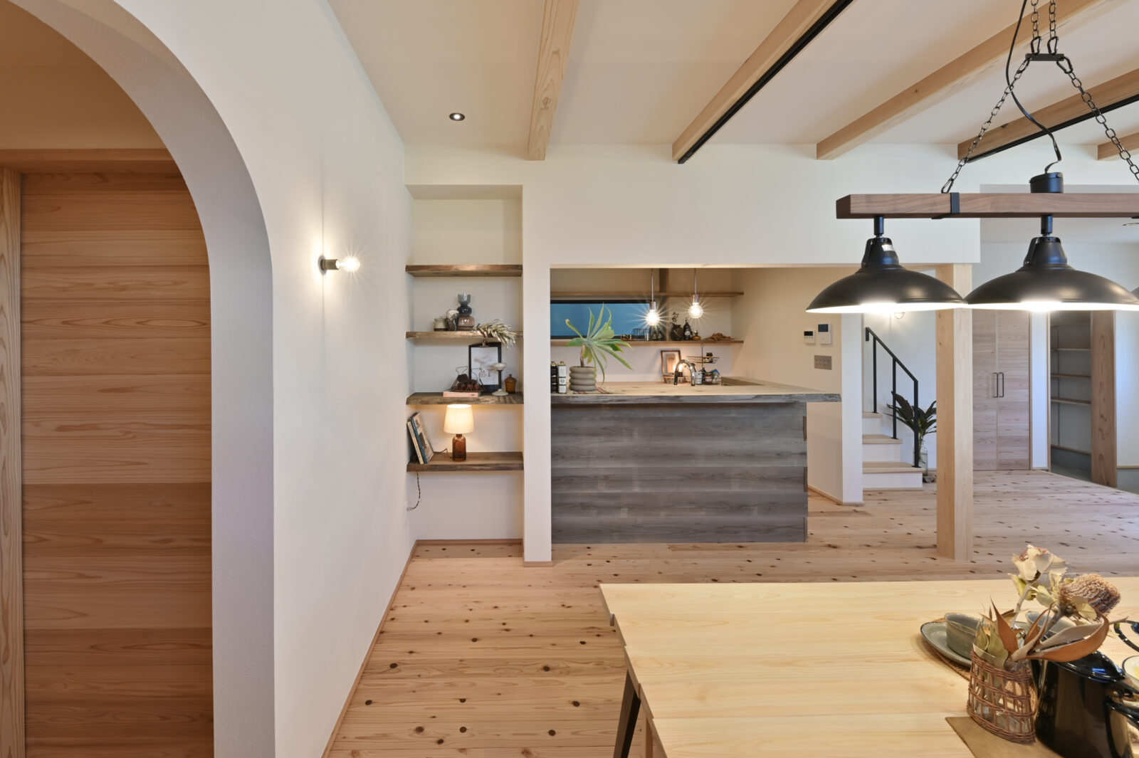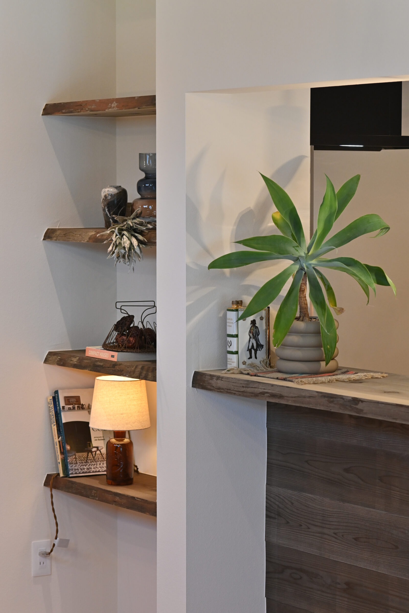 味わいのある杉古材の表情をそのままに使用したキッチンカウンターや飾り棚がアクセントとなっています。