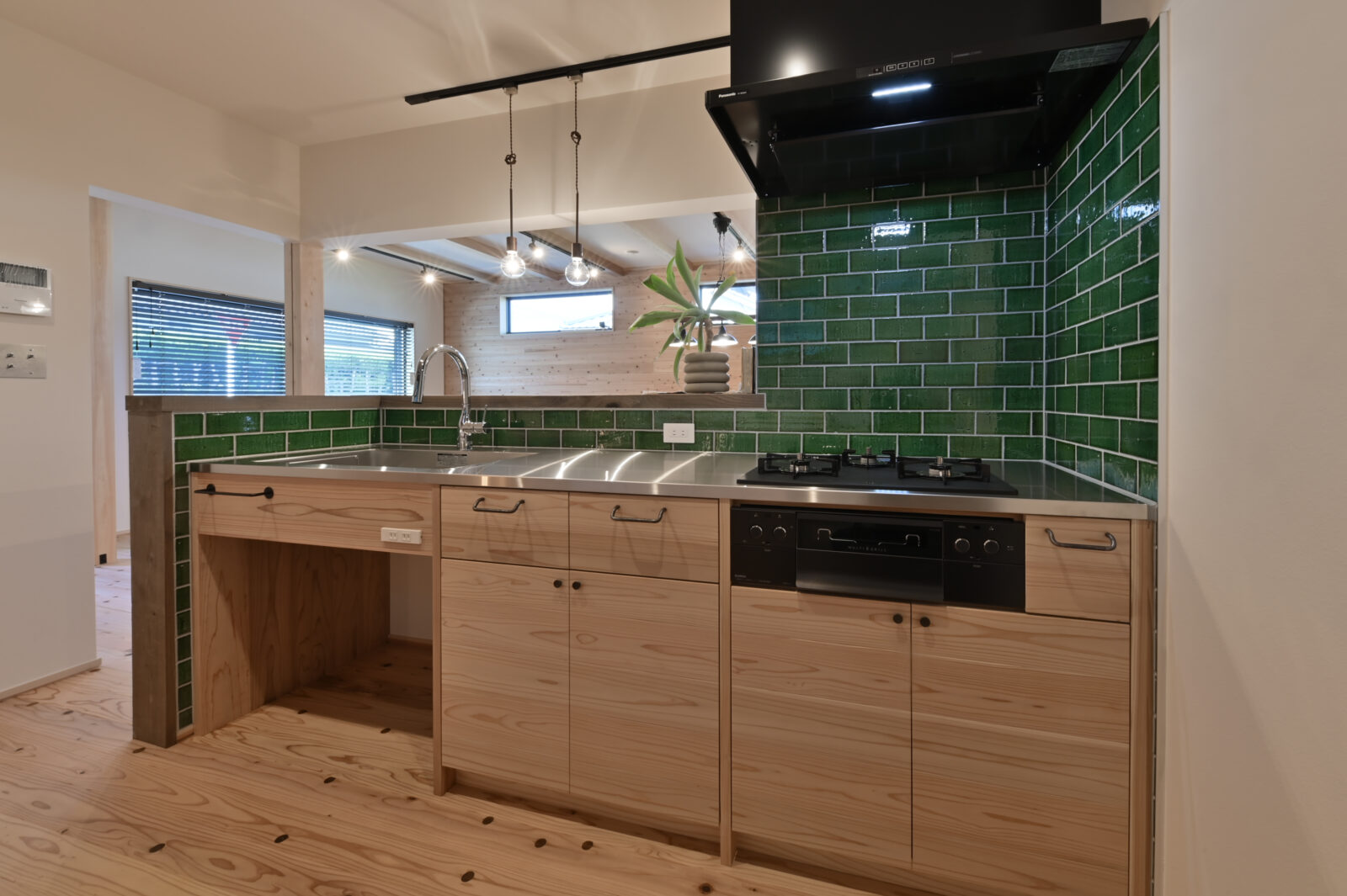 杉材のキッチンとビンテージ感のあるタイルがかっこよく調和しています。