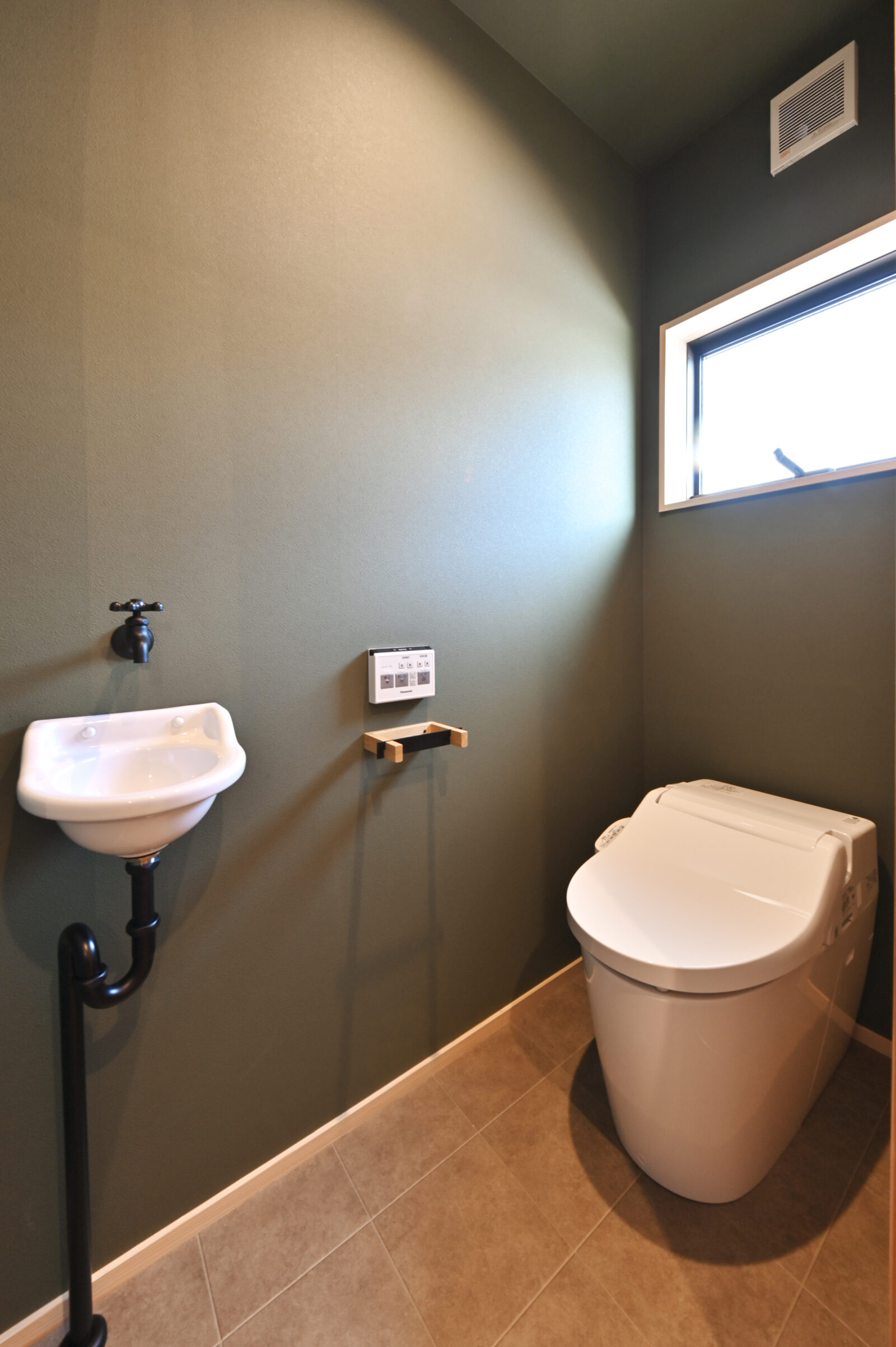 ダークグリーンとシンプルな手洗いの組み合わせ。