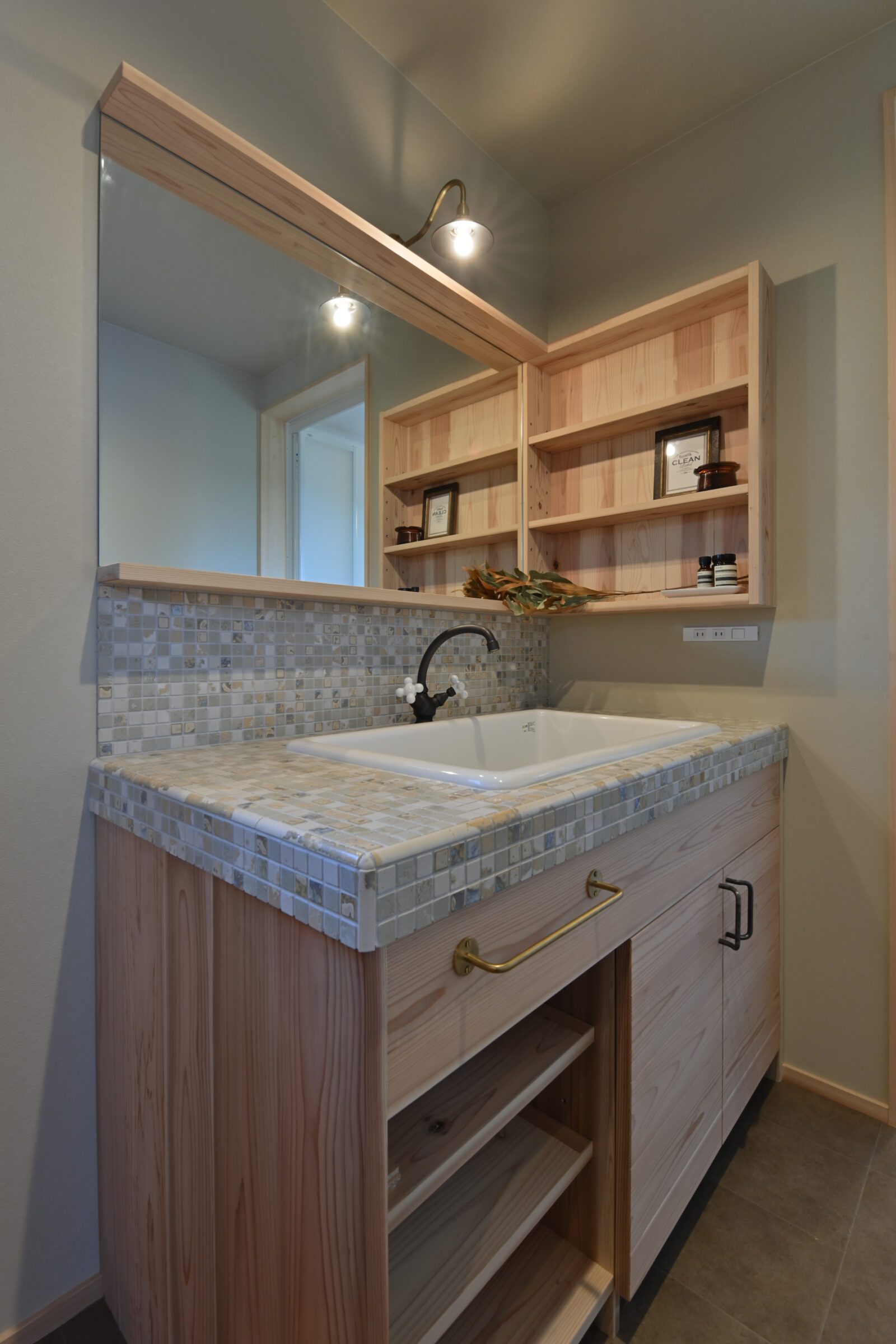 モザイクタイルの天板は、機能性とデザイン性をあわせ持ち、タイルの表情が洗面空間のアクセントになります。